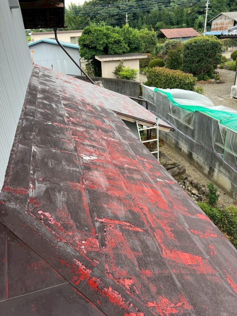 トタン屋根は、経年劣化で塗膜が剥がれ、全体的に色あせていました。